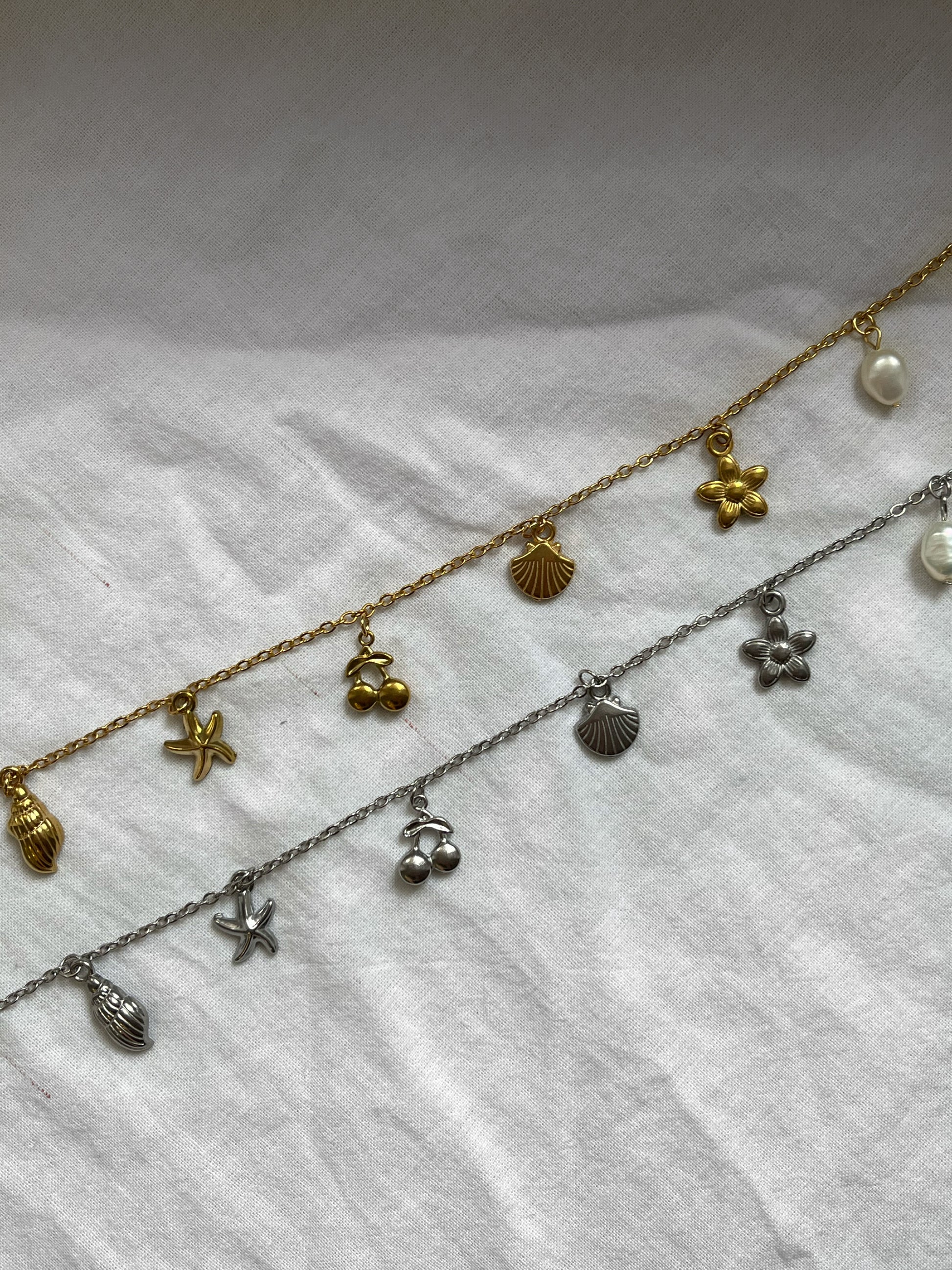 Bring a touch of summer to every step with this elegant anklet decorated with nautical motifs. Shells, stars, pearls and other charming details evoke the feeling of freedom and carefreeness that summer brings. Perfect for wearing with sandals, espadrilles or barefoot on the beach - the anklet is a subtle yet striking addition to any summer outfit.
