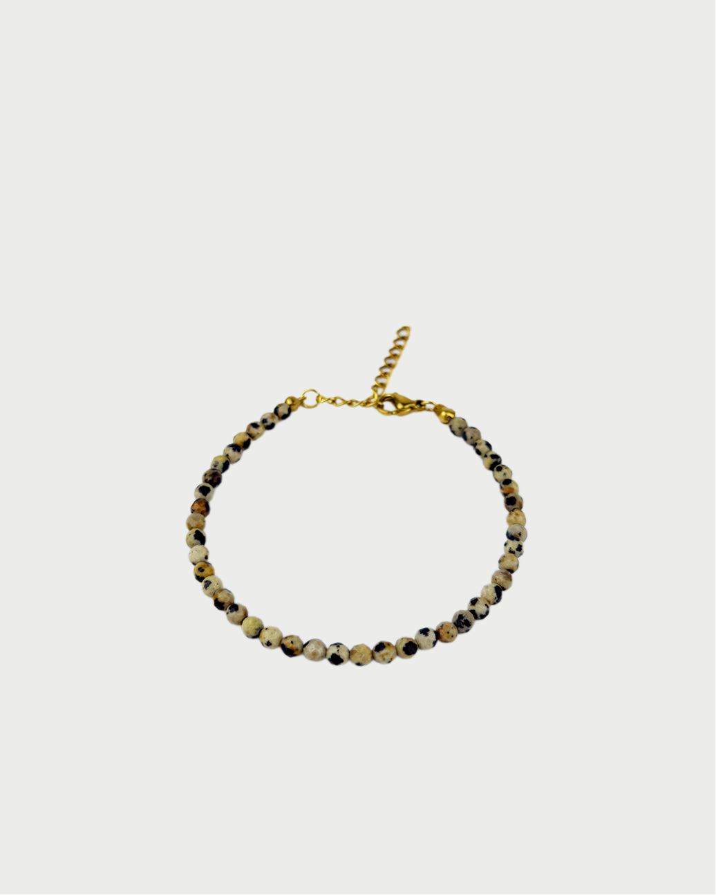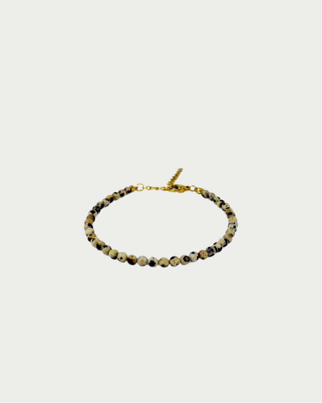 Ova elegantna narukvica s crno-bijelim jaspisom unosi sofisticiranost i ravnotežu u tvoj svakodnevni izgled. Jaspis je poznat po svojim umirujućim svojstvima i energiji koja potiče stabilnost i pozitivne promjene. Kontrastne crno-bijele boje ovog poludragog kamena čine narukvicu jednostavnom, ali snažnom u svom dizajnu, savršeno se uklapajući u svaki outfit.