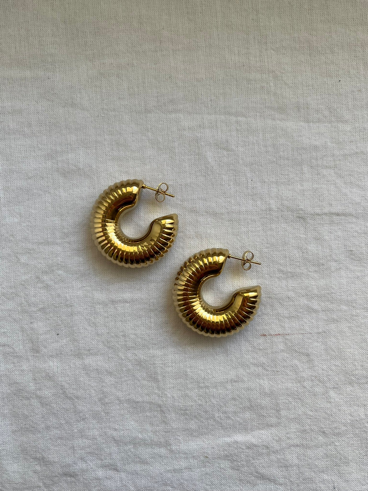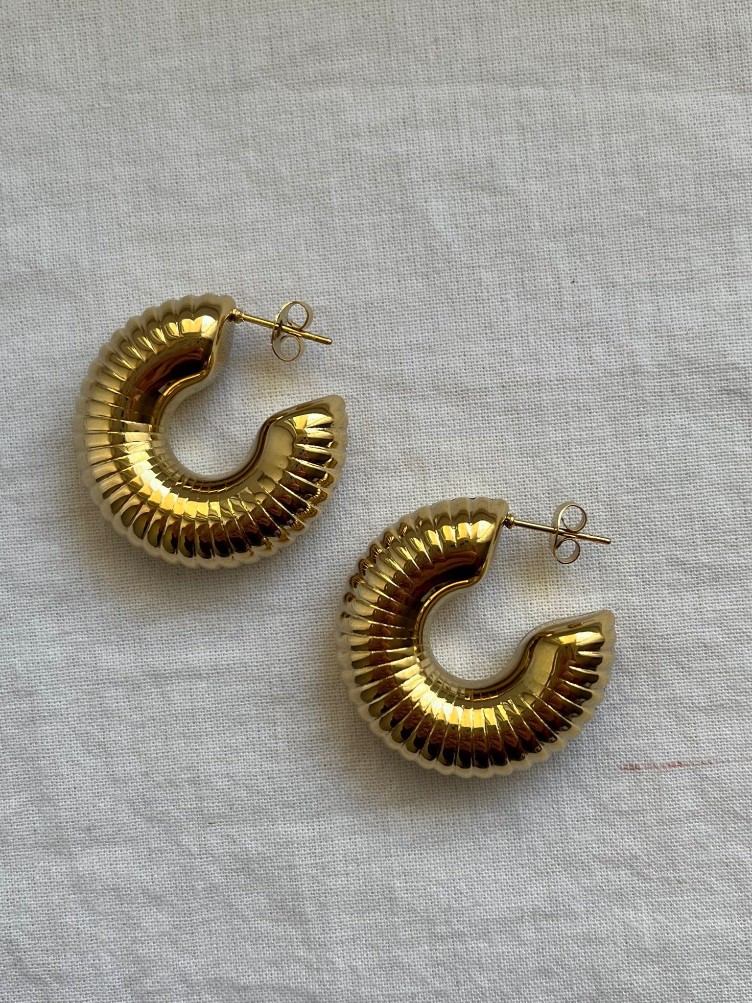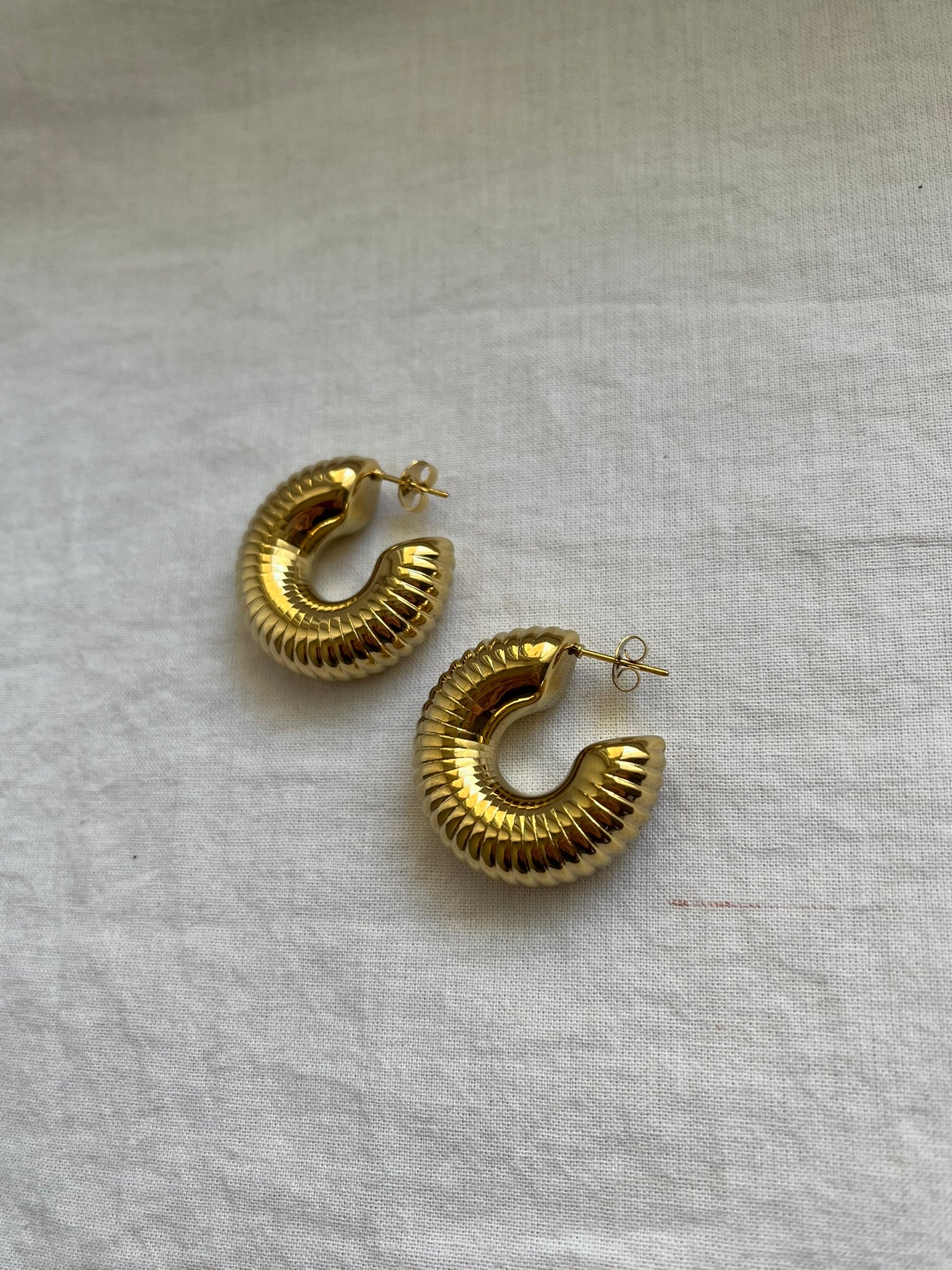 Ove naborane, velike okrugle naušnice donose statement izgled s jedinstvenim teksturiranim dizajnom. Veliki promjer naušnica čini ih upečatljivim dodatkom koji će podići svaki outfit. Izrađene od nehrđajućeg čelika s 18k pozlatom, ove naušnice su dugotrajne, otporne na tamnjenje i jednostavno se uklapaju u različite stilove.