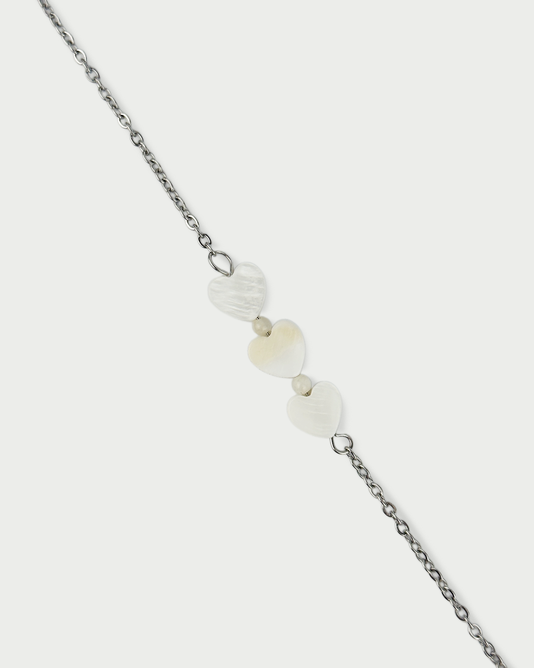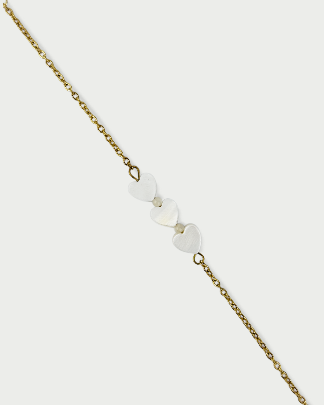 Ova nježna narukvica s tri sedef srca donosi sofisticiranst svakom outfitu. Sedef daje elegantan sjaj, dok minimalistički dizajn s tri mala srca čini narukvicu savršenim izborom za svakodnevno nošenje.