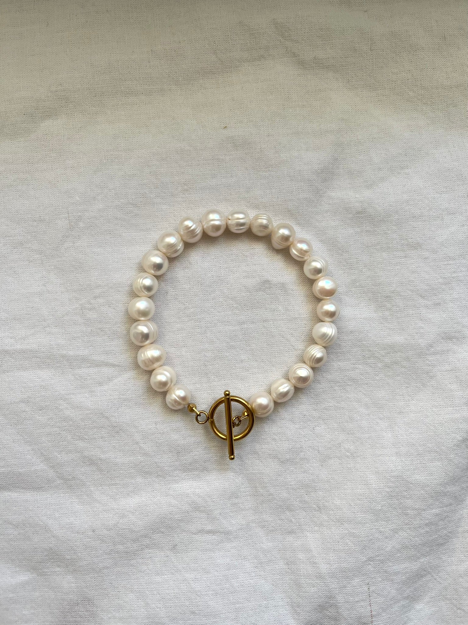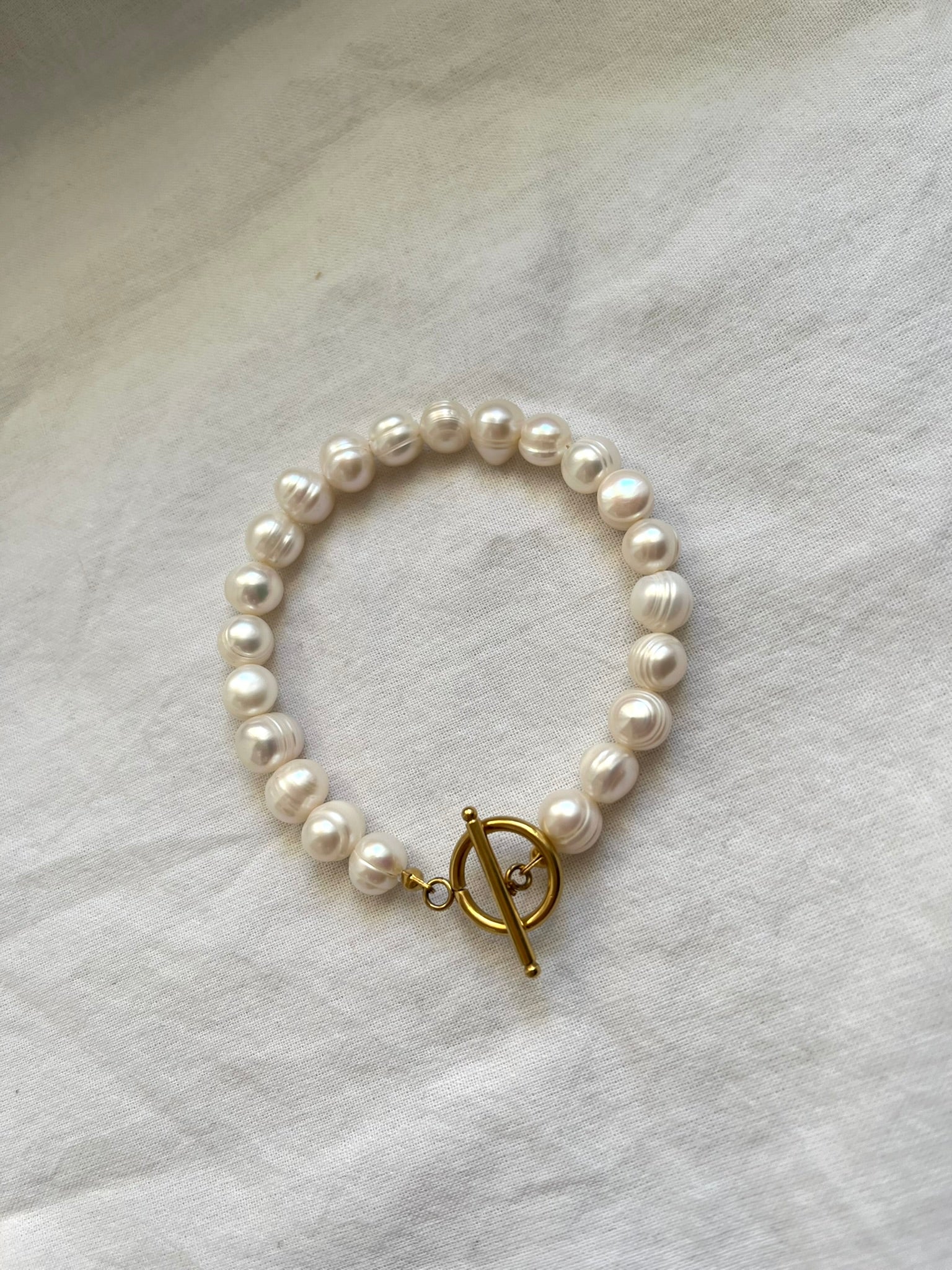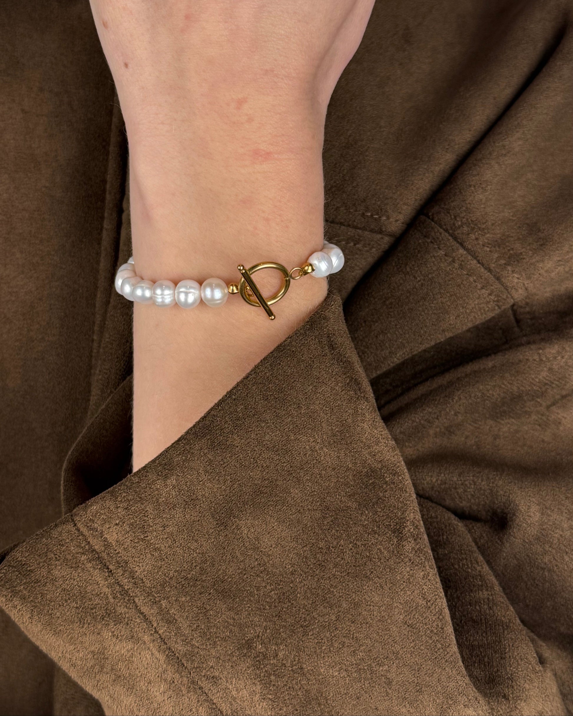 Ova upečatljiva statement narukvica s riječnim biserima unosi luksuz i sofisticiranost u svaki outfit. Svaki biser pažljivo odabran za svoj prirodni sjaj i jedinstvenost, stvarajući elegantan izgled. Idealna za posebne prilike ili kao glavni detalj u svakodnevnim kombinacijama, ova narukvica će privući pažnju i podići tvoj stil na višu razinu. Izrađena od visokokvalitetnog nehrđajućeg čelika s 18k pozlatom, pruža dugotrajan, luksuzan izgled.
