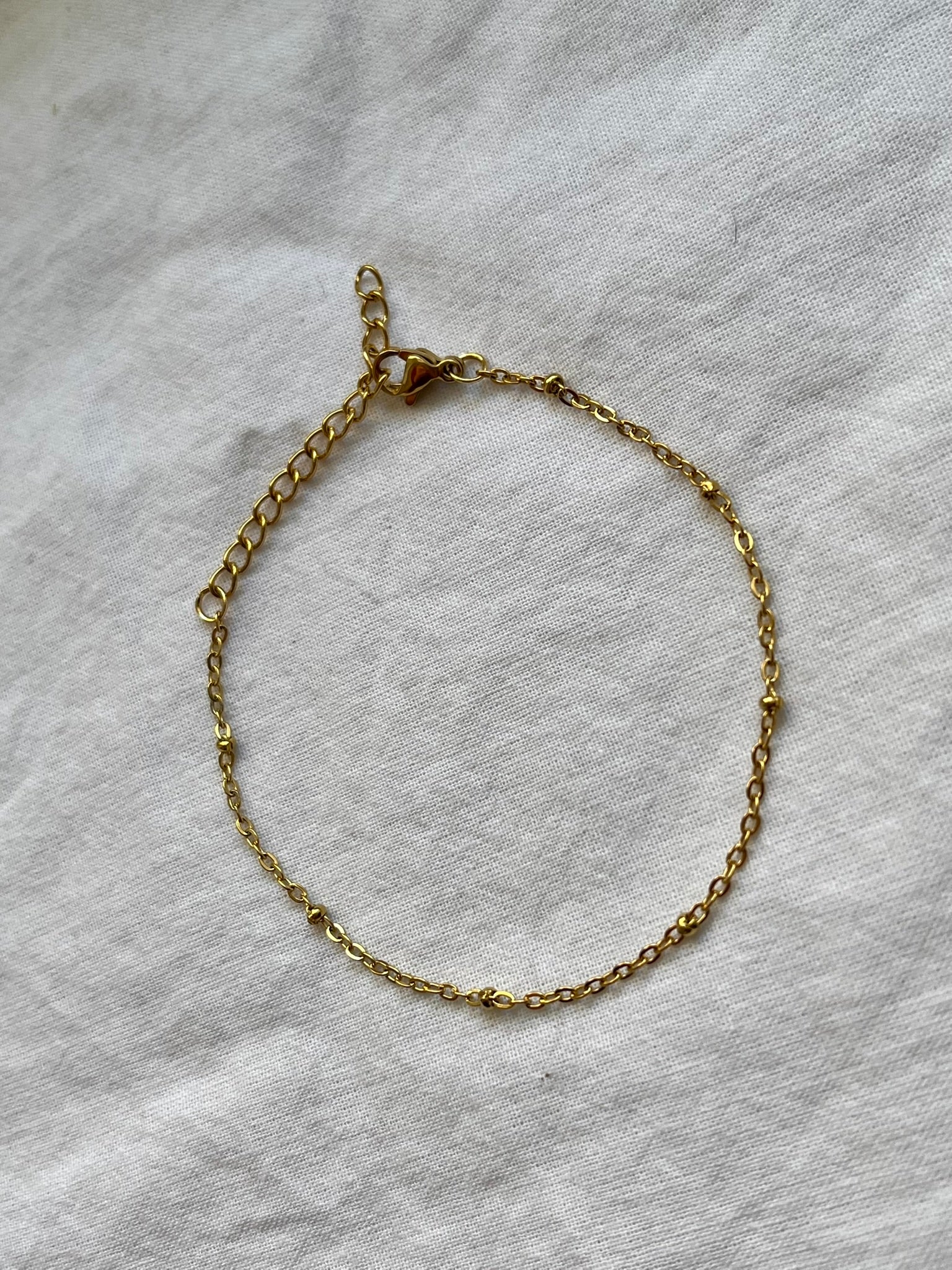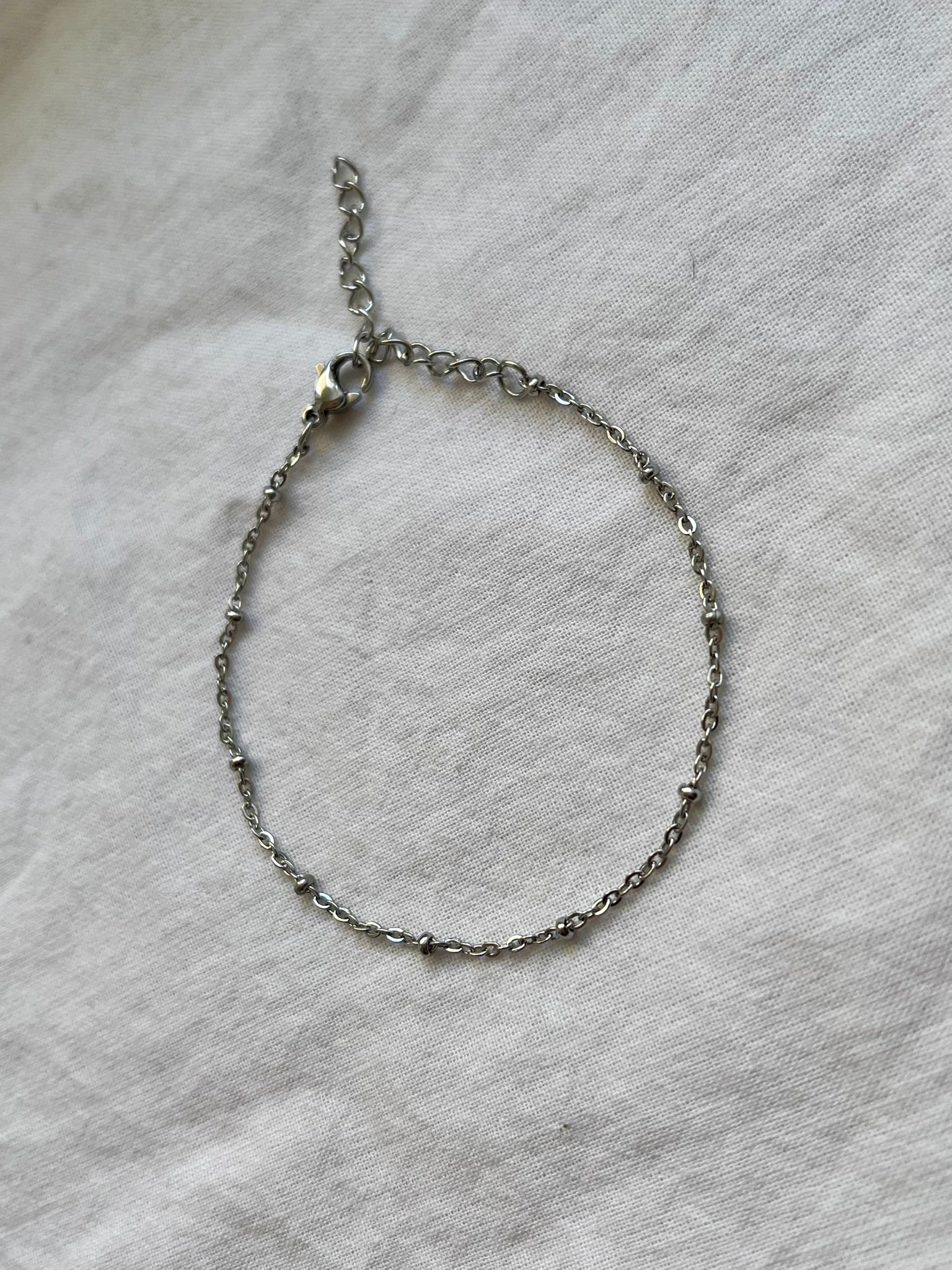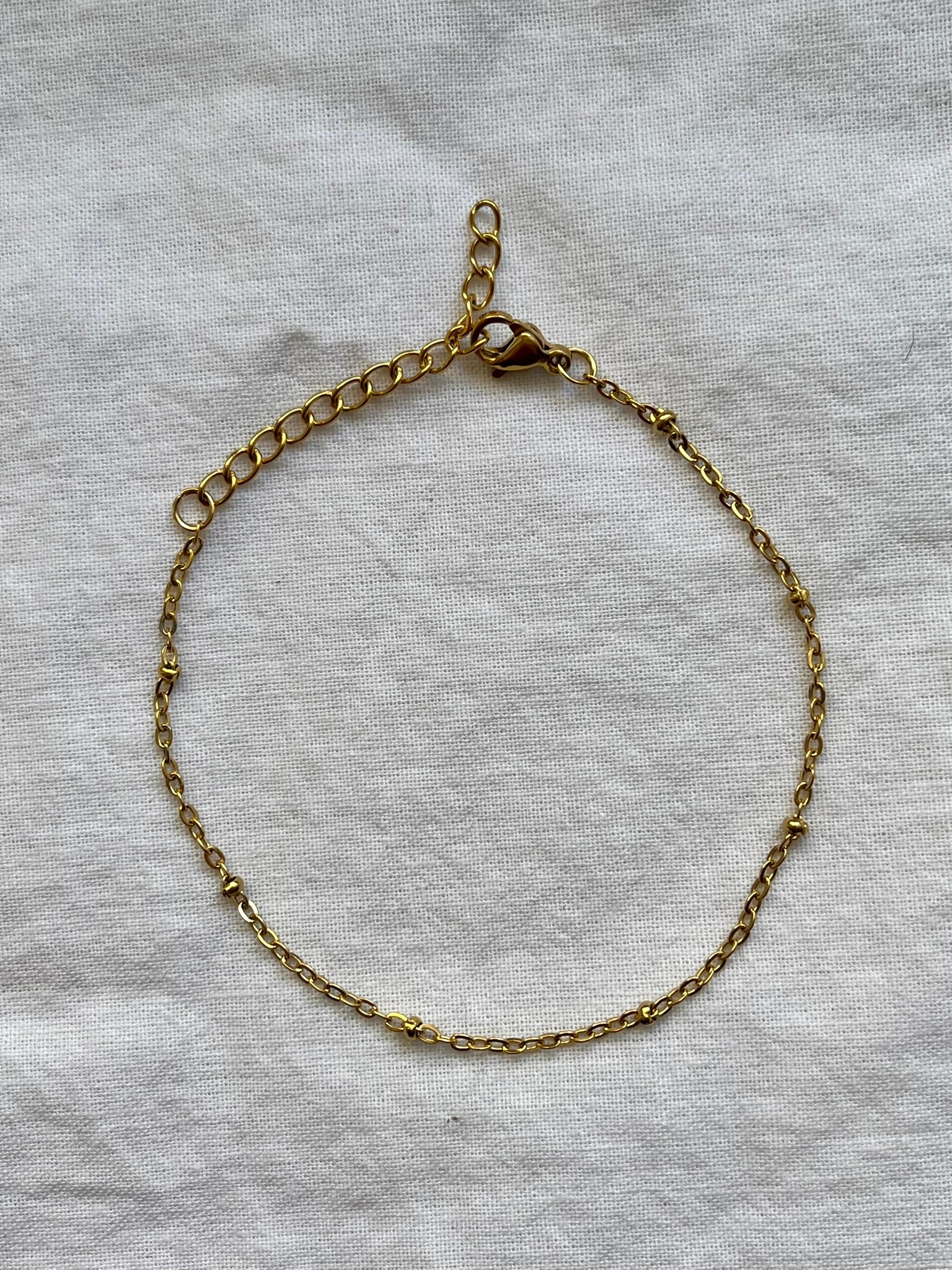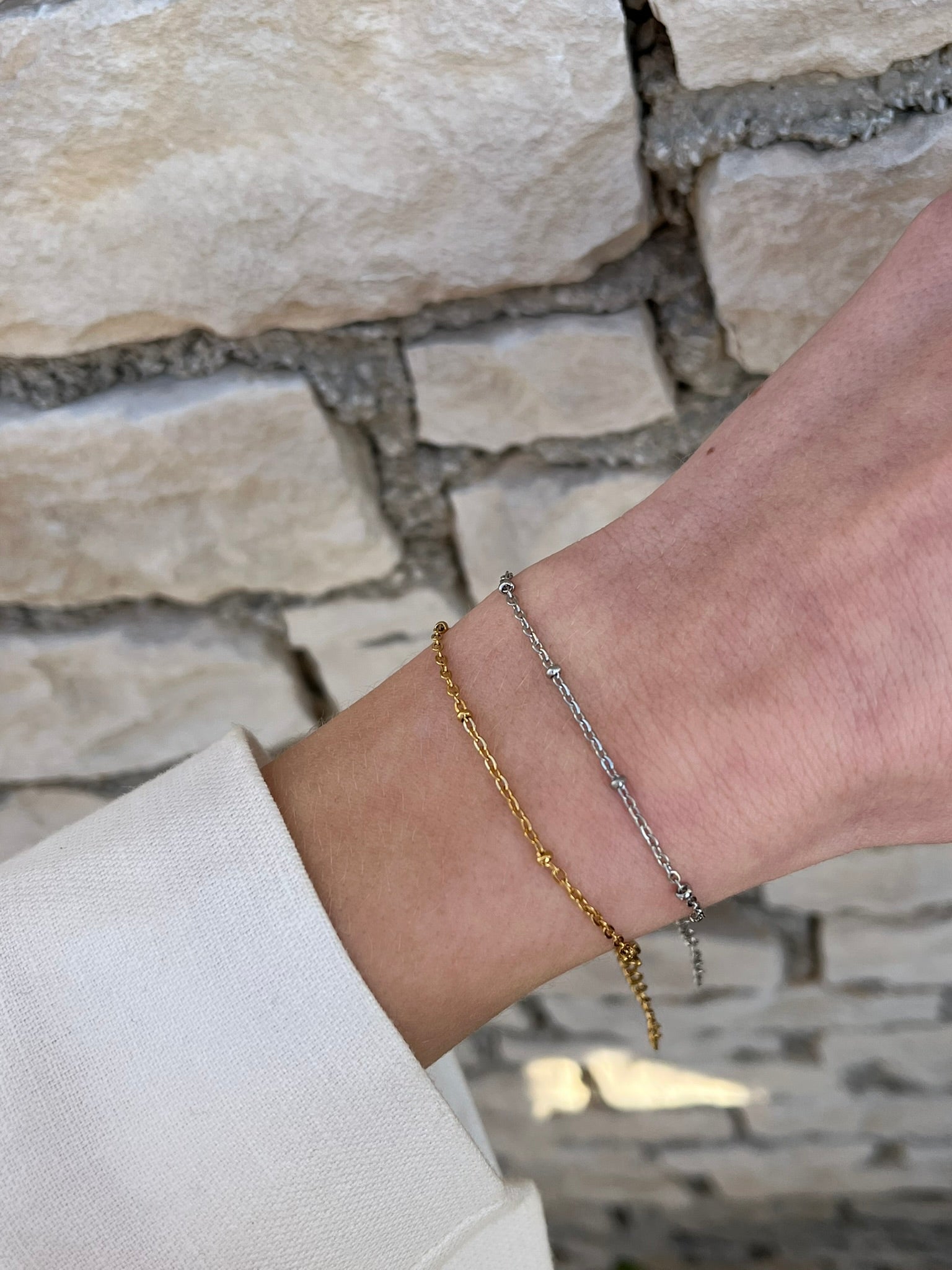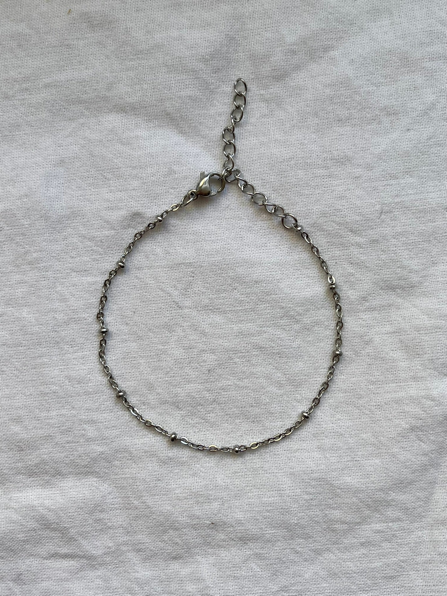 Ova jednostavna narukvica s malim metalnim kuglicama dodaje suptilan detalj klasičnom dizajnu. Elegantna i svestrana, idealna je za svakodnevno nošenje i lako se kombinira s drugim komadima nakita.