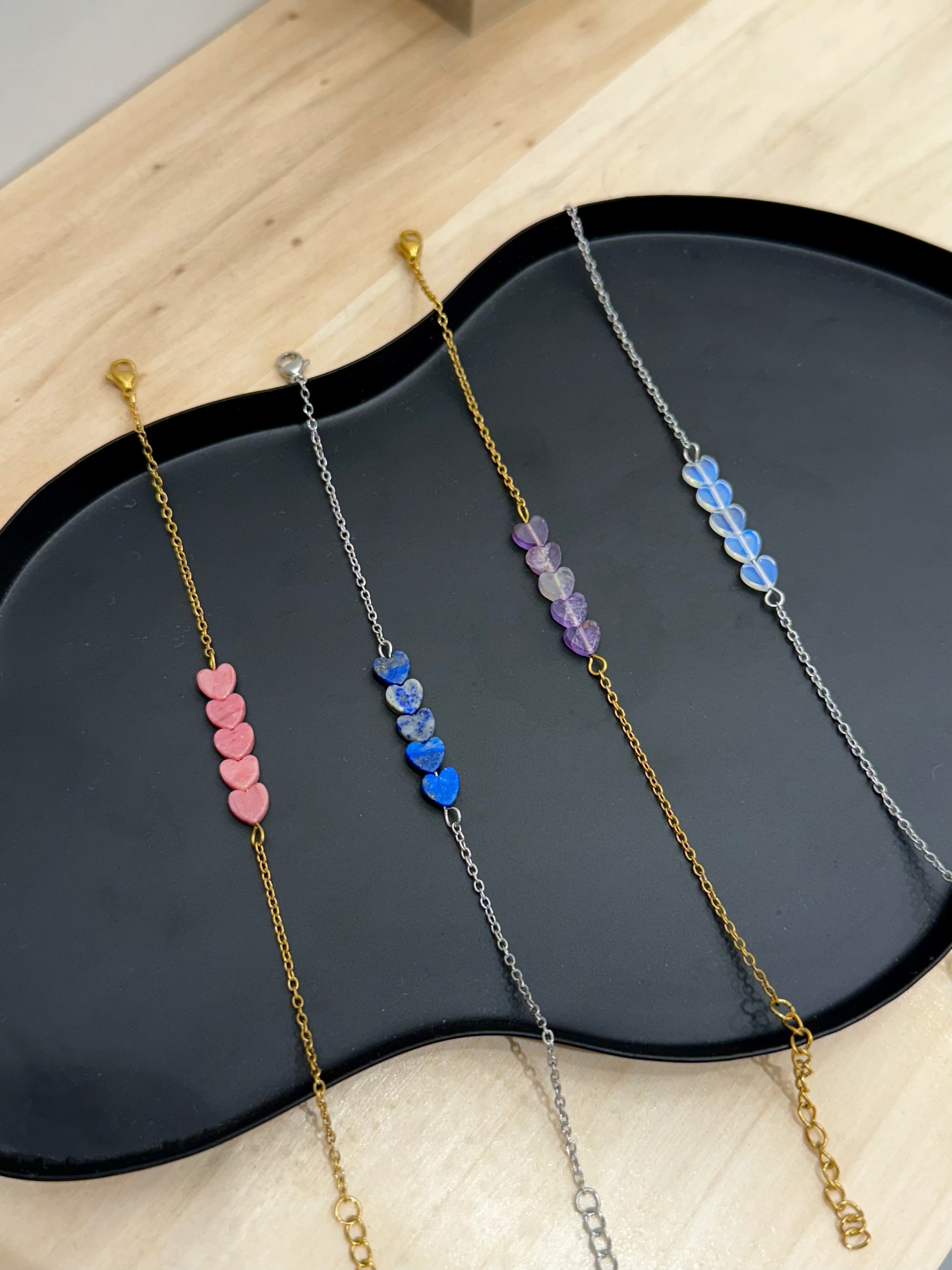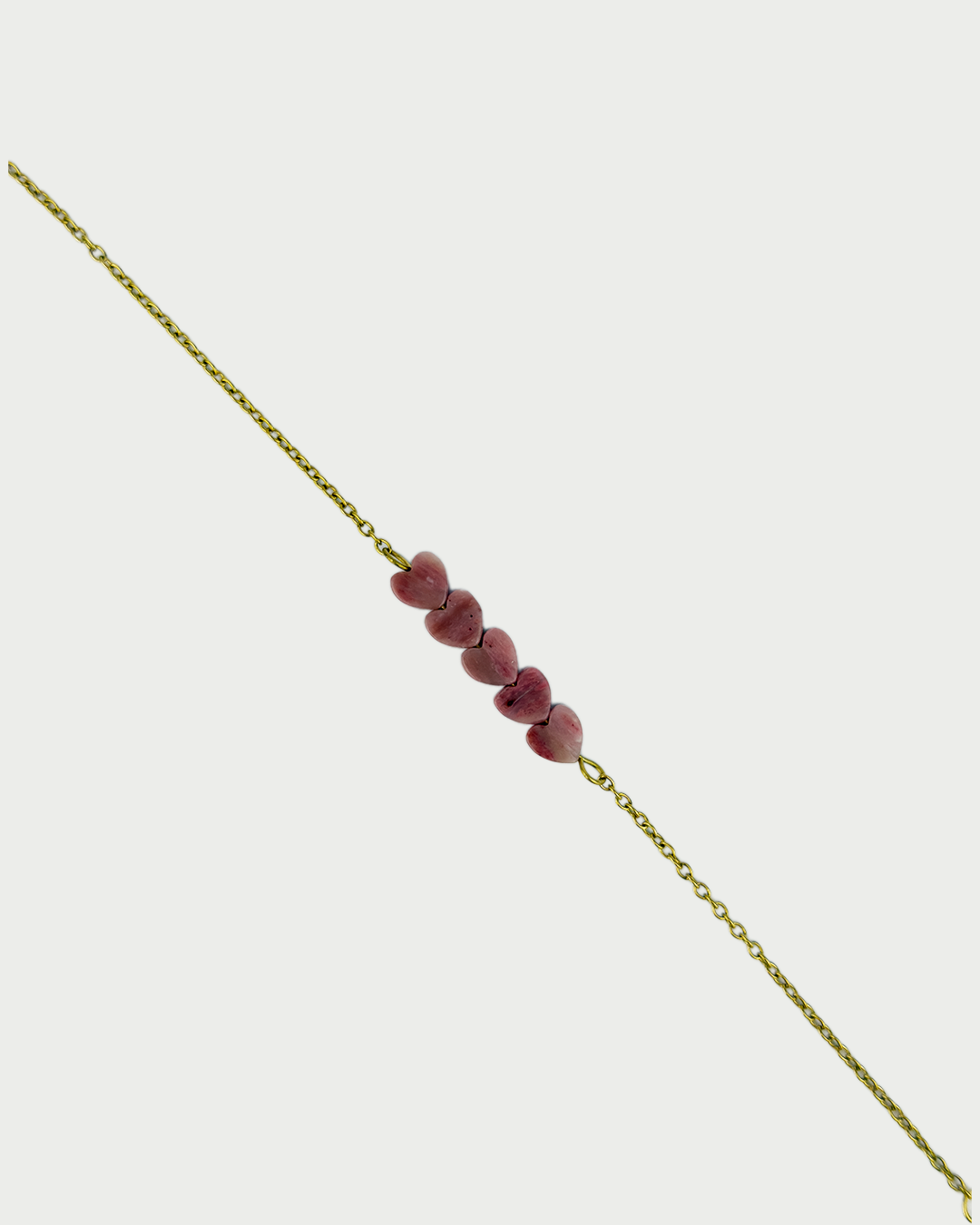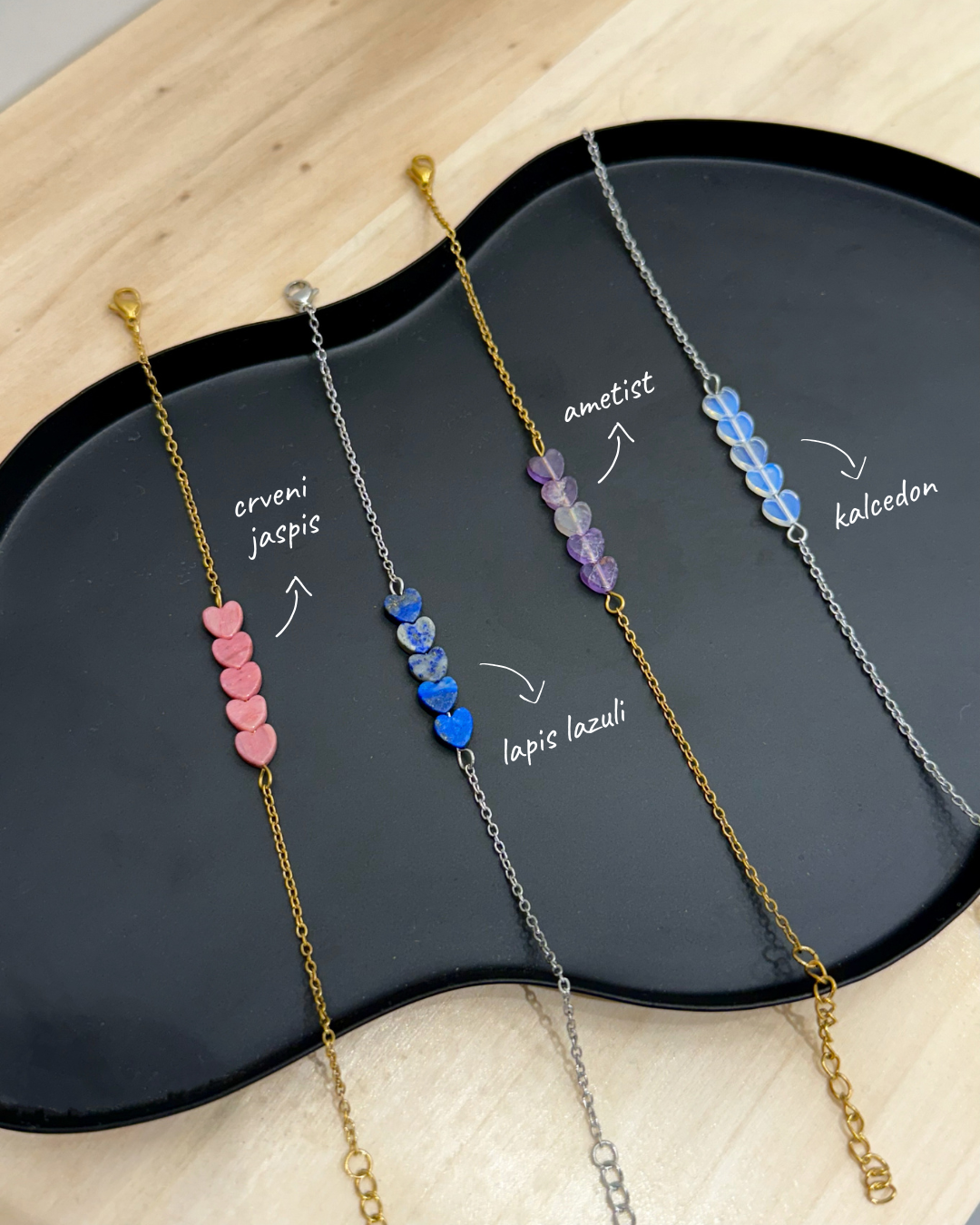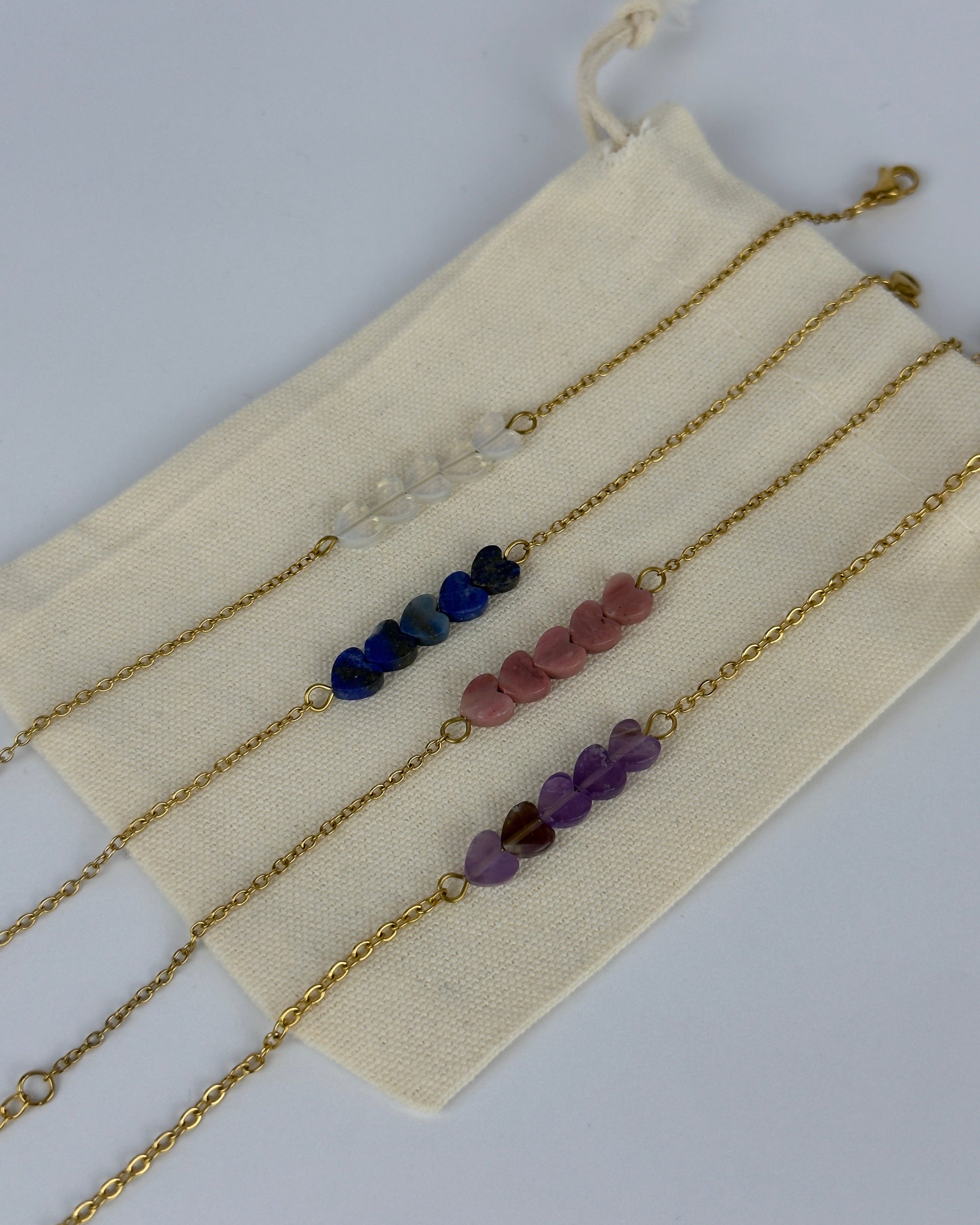 Unesi nježnu, ali snažnu simboliku u svoj svakodnevni stil uz našu narukvicu sa srcima od poludragog kamenja. Svako srce pažljivo je odabrano i nosi svoju prirodnu ljepotu i energiju.