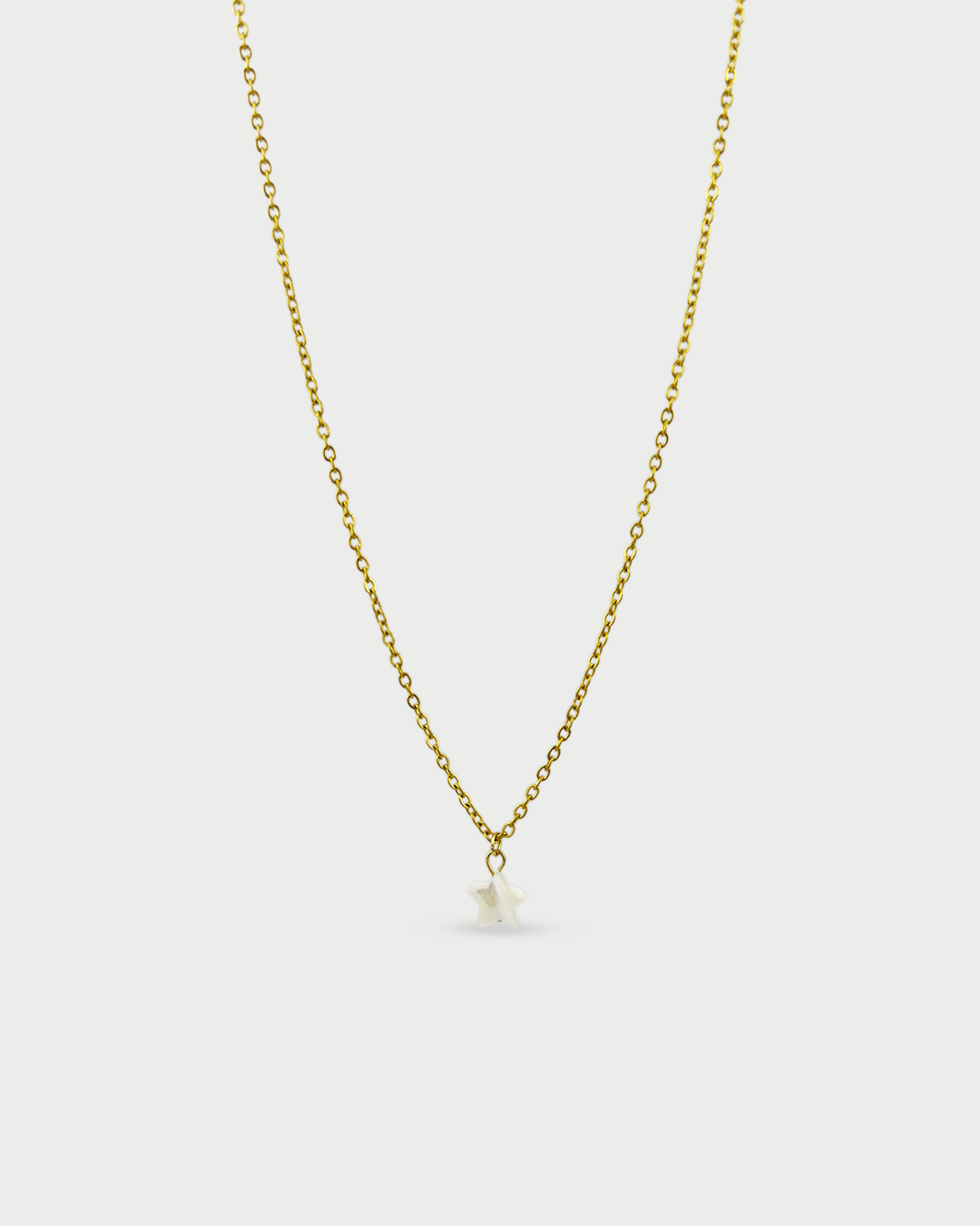 Elegantna pozlaćena ogrlica s malim privjeskom zvjezdice od sedefa. Savršena za svakodnevne kombinacije i layering. Privjesak sjaji na suncu, dajući ogrlici nježan, svjetlucavi efekt.
