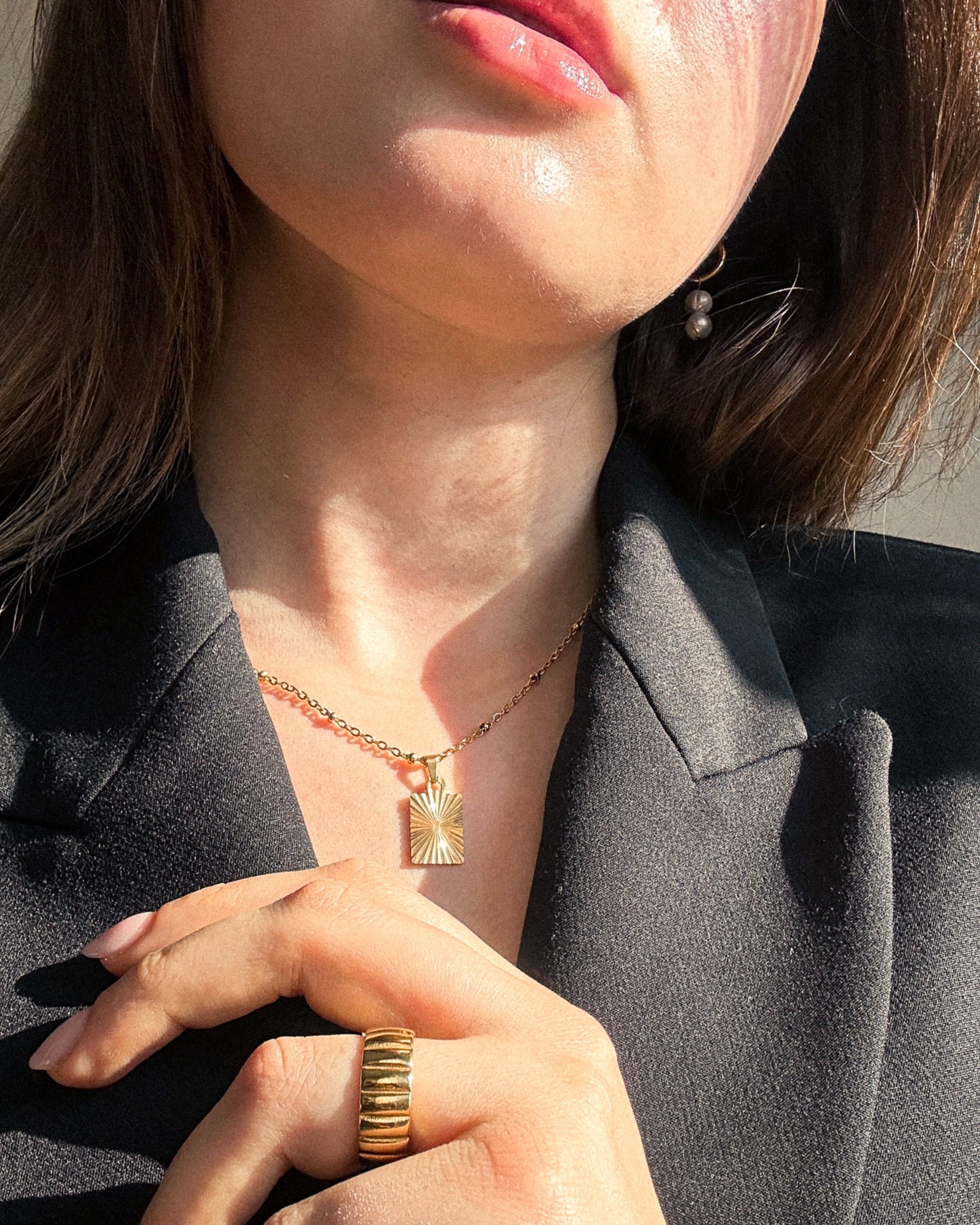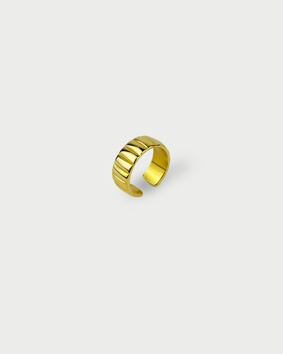Ovaj naborani prsten donosi jedinstveni teksturirani dizajn koji dodaje sofisticiranost svakom looku. Izrađen od nehrđajućeg čelika s 18k pozlatom, dugotrajan je i otporan na tamnjenje, idealan za svakodnevno nošenje. Savršen je za sve koji vole jednostavne, ali efektne komade.