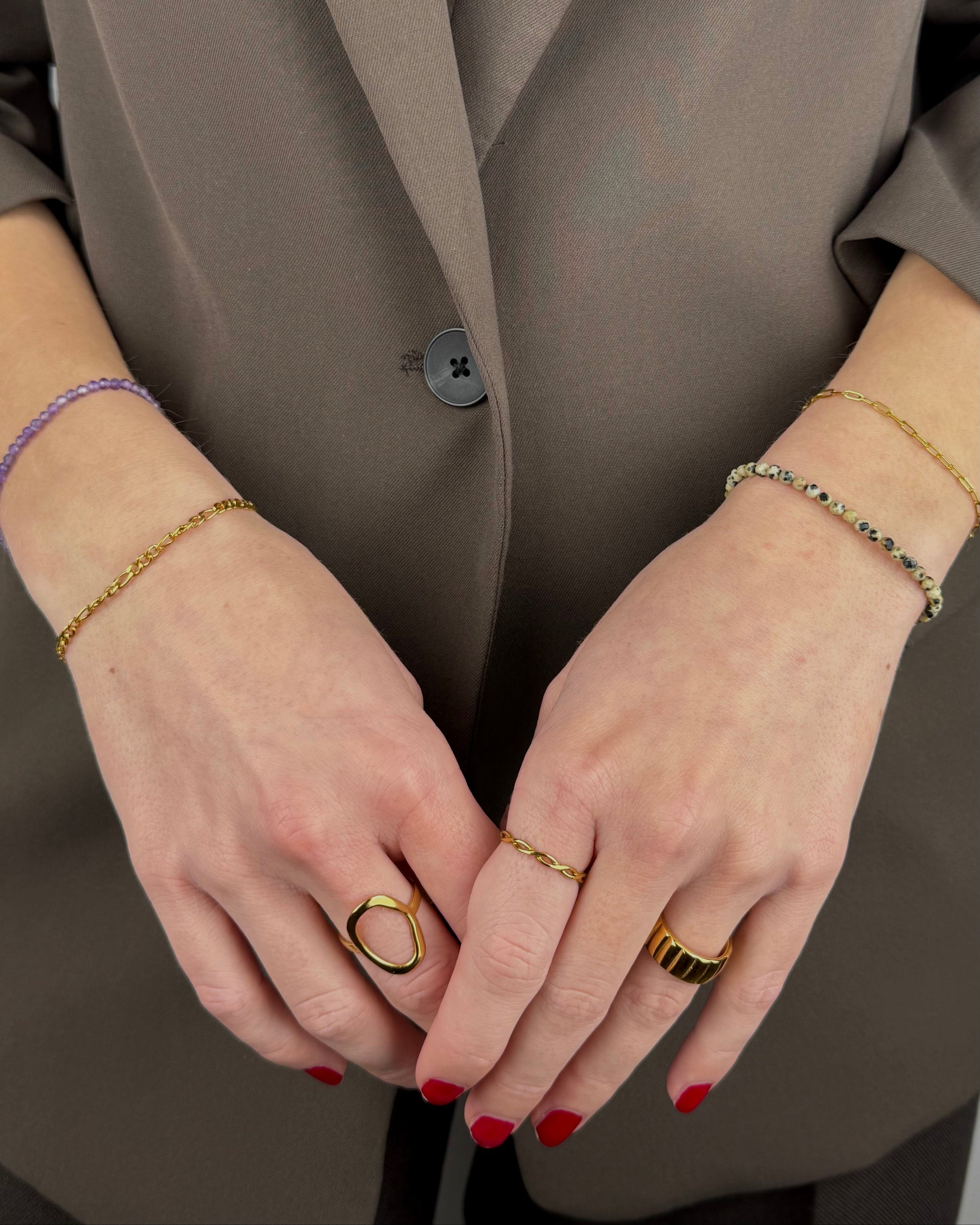 Twist prsten idealno pristaje svakodnevnim kombinacijama, ali i posebnim prilikama, dodajući im sofisticirani detalj. Može se nositi samostalno za minimalistički efekt ili u kombinaciji s drugim prstenjem za moderni slojeviti izgled.